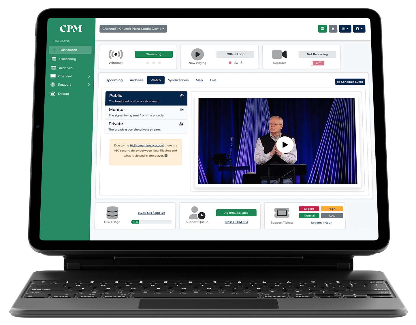 A live bird's-eye view of the channel allows a quick view of encoder connection status, live feed, viewer totals, real-time viewer maps, disk usage, and support queue status. Viewer statistics are automatically collected, including geographic location. Reports are sent to all administrators once the broadcast is complete.